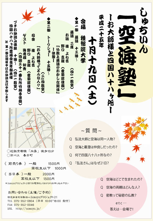 | 【概 要】 | 10月19日(土) 第一部 落語 13時~ 落語 二席(401教室) お話 桂よね吉 野口真龍(愛染院住職) 「仏教と落語のおかしな関係」 第二部 トークショー 15時~ 「お大師様ってどんな人?」(204教室) 司会 桂よね吉 野口真龍(愛染院住職) ゲスト 海老塚和秀(四国三十一番礼所竹林寺住職) プチお砂踏み体験 10時~(401教室) 四国八十八ヶ所霊場会青年部共催 ※第一部の開催中はお砂踏みは中断します |
