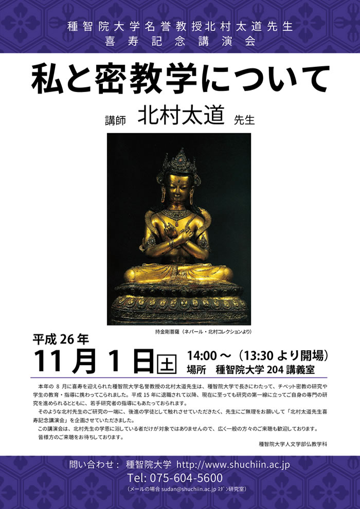 | 14.10/23 | 【イベントのご案内】 種智院大学名誉教授北村太道先生 喜寿記念講演会 「私と密教学について」 講師 北村太道 先生 ![]() 主催は種智院大学です。 詳しくは種智院大学ホームページをご覧ください。 http://www.shuchiin.jp/news/?p=974 こちらのイベントは終了いたしました。 たくさんのご参加ありがとうございました。 |
