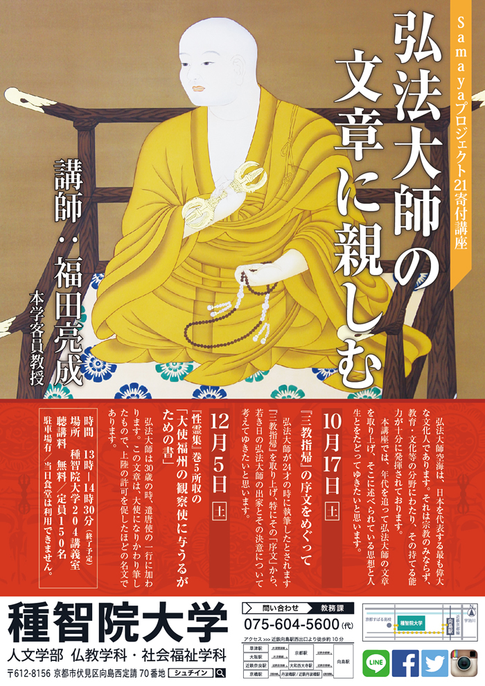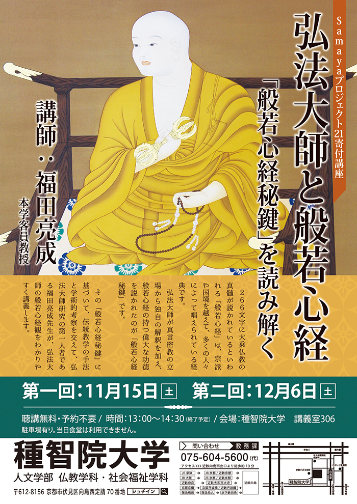 | 13. 09/10 | 【イベントのご案内】 福田先生寄附講座 「弘法大師空海の教え-弁顕密二教論講読-」 【日 時】10月5日(土) 「弘法大師空海の教え-弁顕密二教論講読-I」 11月16日(土) 「弘法大師空海の教え-弁顕密二教論講読-II」 11月30日(土) 「弘法大師空海の教え-弁顕密二教論講読-III」 いずれも13:00~14:30 【場 所】種智院大学 講義室306 【講 師】福田 亮成 氏(種智院大学客員教授) 【受講料】予約不要・無料、直接会場にお越しください。 ≫ 詳しくはこちら ≫ 種智院大学HP (外部サイト) |