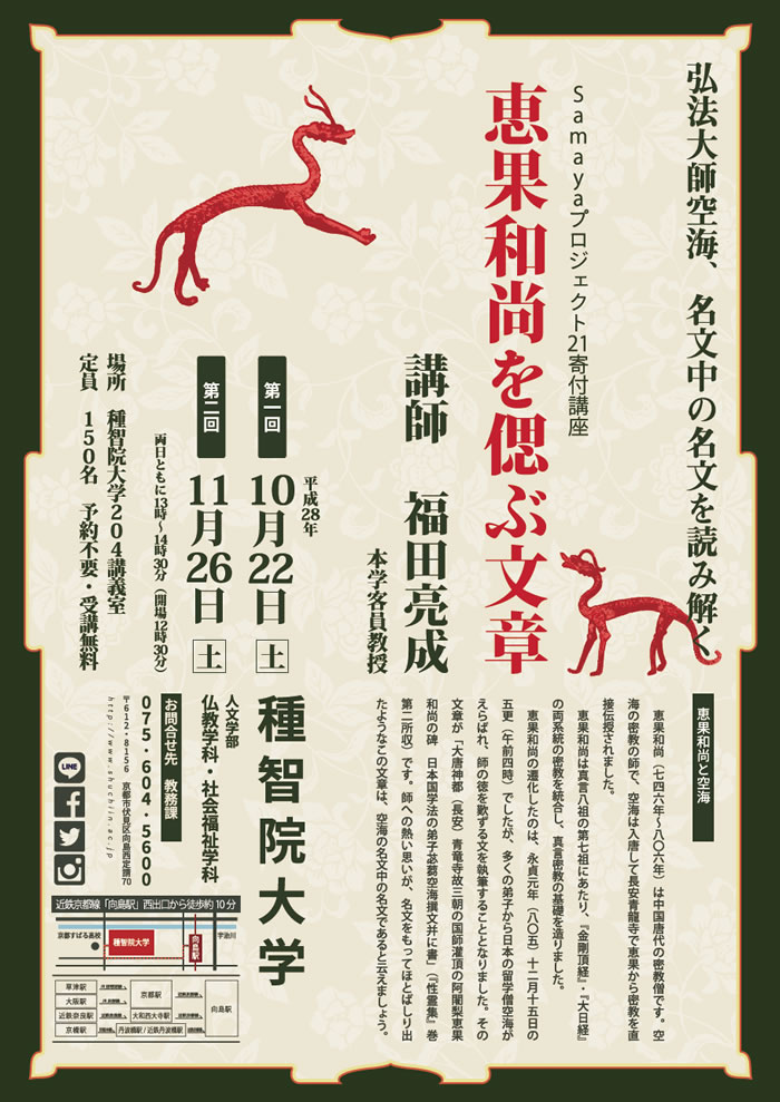 | 16.09/29 | 【イベントのご案内】 恵果和尚を偲ぶ文章 【日 時】 平成28年10月22日(土) 平成28年11月26日(土) いずれも13:00~14:30(終了予定) 【場 所】 種智院大学 204講義室 【定 員】 150名 【講 師】 福田 亮成 氏(種智院大学客員教授) 【受講料 】予約不要・無料、直接会場にお越しください。 ![]() 詳しくは種智院大学ホームページをご覧ください。 http://www.shuchiin.ac.jp/lifelong_learning/extension.html |