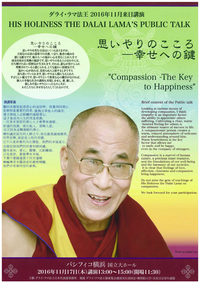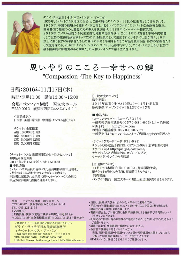 | 16.10/20 | ダライ・ラマ法王 横浜講演 2016 『思いやりのこころ―幸せへの鍵』 【日 時】 2016年11月17日(木) 開場11:30 講演13:00~15:00 【会 場】 パシフィコ横浜 国立大ホール 〒220-0012 横浜市西区みなとみらい1-1-1 【チケット】 全席指定 A席 10,000円(1階) B席 8,000円(1階) C席 5,000円(2階) D席 3,000円(3階) ≫ 詳しくはこちら 【お問い合わせ先】 ダライ・ラマ法王日本代表部事務所 (チベットハウス・ジャパン) 〒161-0031東京都新宿区西落合3丁目26番1号 TEL:03-5988-3576 FAX:03-3565-1360 URL:http://www.tibethouse.jp E-mail:lohhdl@tibethouse.jp